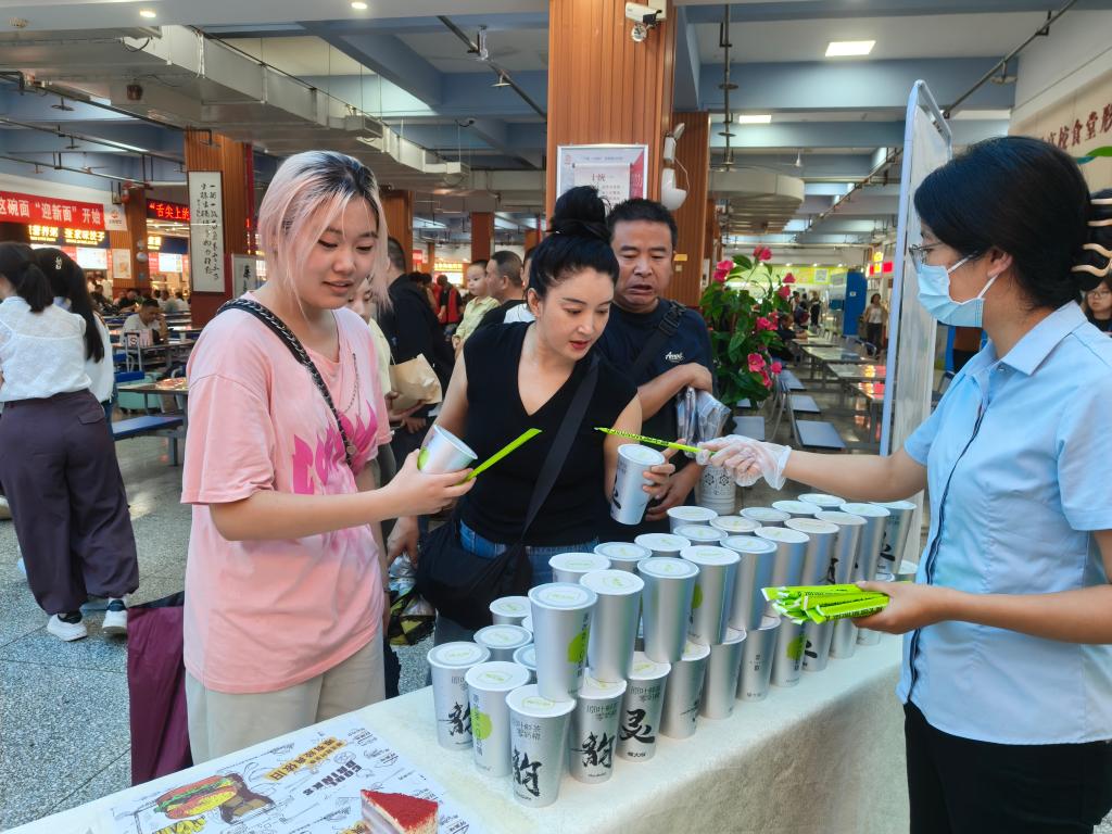 除了特色美食,饮食服务中心还在迎新点旁设置了“暖心补给站”,工作人员主动为提着行李的新生、家长递上瓶装水;场内多家餐饮商户也积极加入迎新队伍,有的免费赠送清爽果茶,有的派发营养牛奶,有的提供酥脆小点心,丰富的选择不仅让大家尝到了美味,也让新生提前熟悉了校园的餐饮服务。