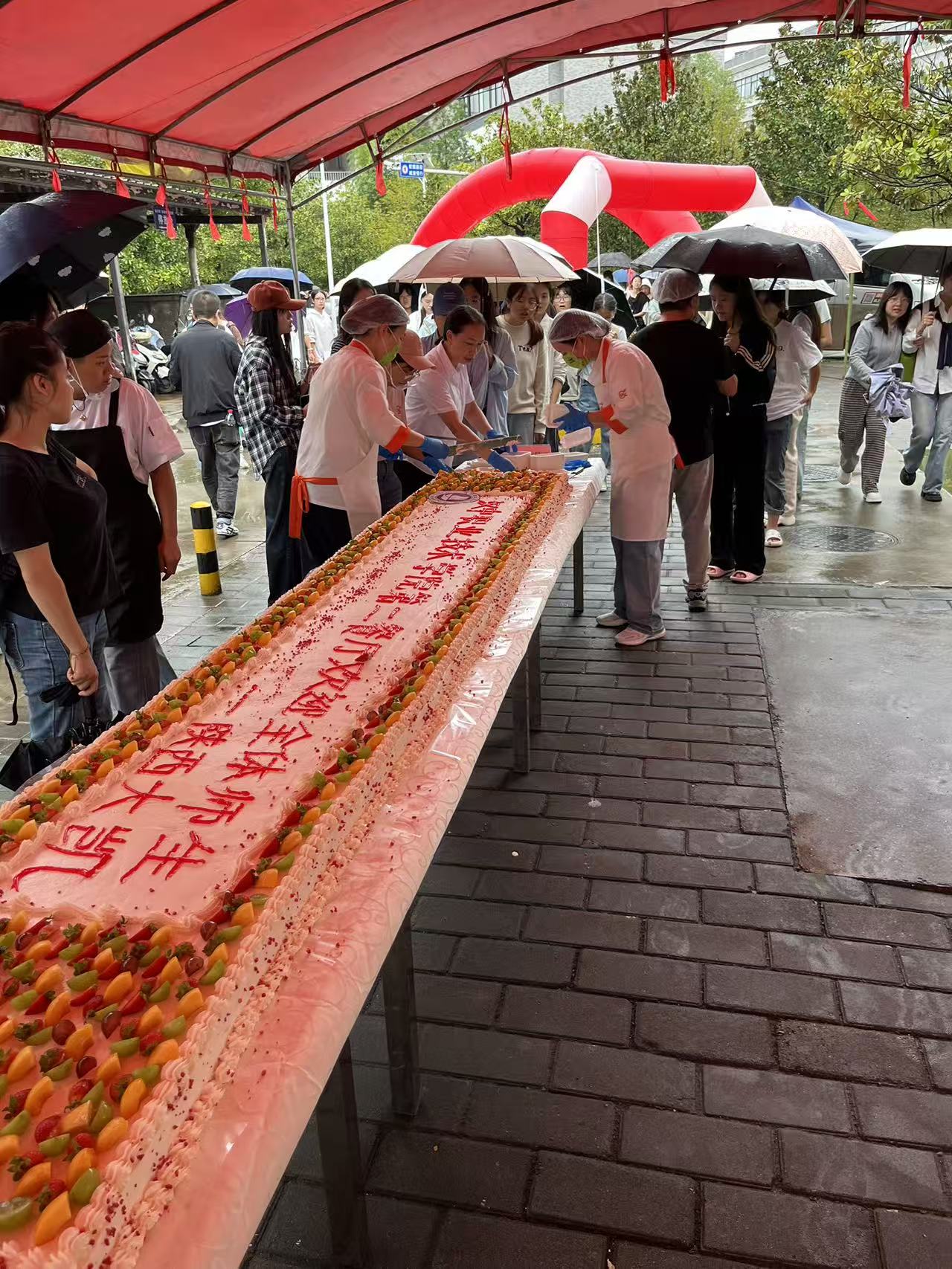 活动当天,尽管细雨绵绵,饮食服务中心活动现场依旧人气满满。工作人员现场制作的巨型蛋糕是全场“甜系焦点”,雪白奶油裹着饱满果肉层层堆叠,制作过程中便吸引不少新生与家长驻足观看;一旁的拉面摊位热气升腾,师傅们手工抻面、现煮现捞,筋道的牛肉拉面刚出锅就飘着香气;新鲜出炉的糕点也整齐码放,松软口感惹人垂涎。待美食备好后,工作人员迅速分装,免费递到新生和家长手中,一口甜、一口暖,瞬间缓解了旅途奔波与雨天的微凉。